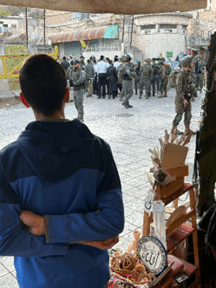 As the “tour group” approached our area of the city, we stood at the front of Bader’s shop ready to document any incidents. First, we saw a group of about 20 soldiers come through clearing the way and making people move off the street. One of the soldiers came over to us and forced us to step back inside the shop. It felt like we were cattle being herded. Behind the soldiers came a group of about 100 settlers. Pointing, laughing, taking in the sights, and mocking the people waiting to get back to their daily life. Some of them saw us and pointed and yelled “Americans!”